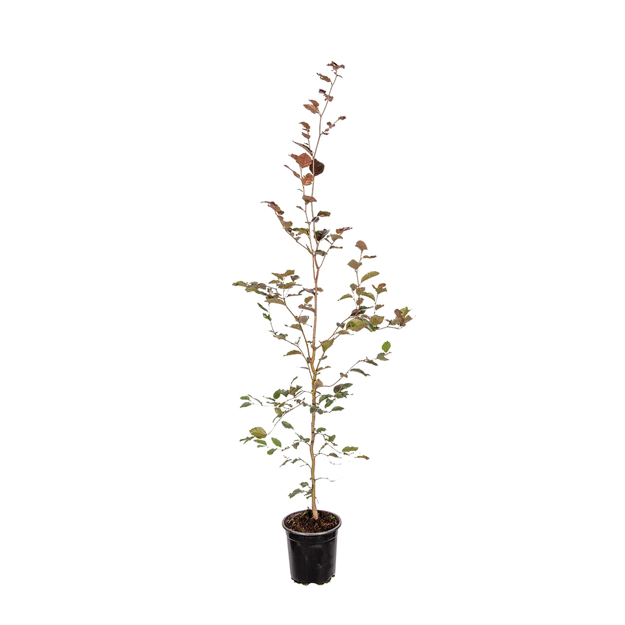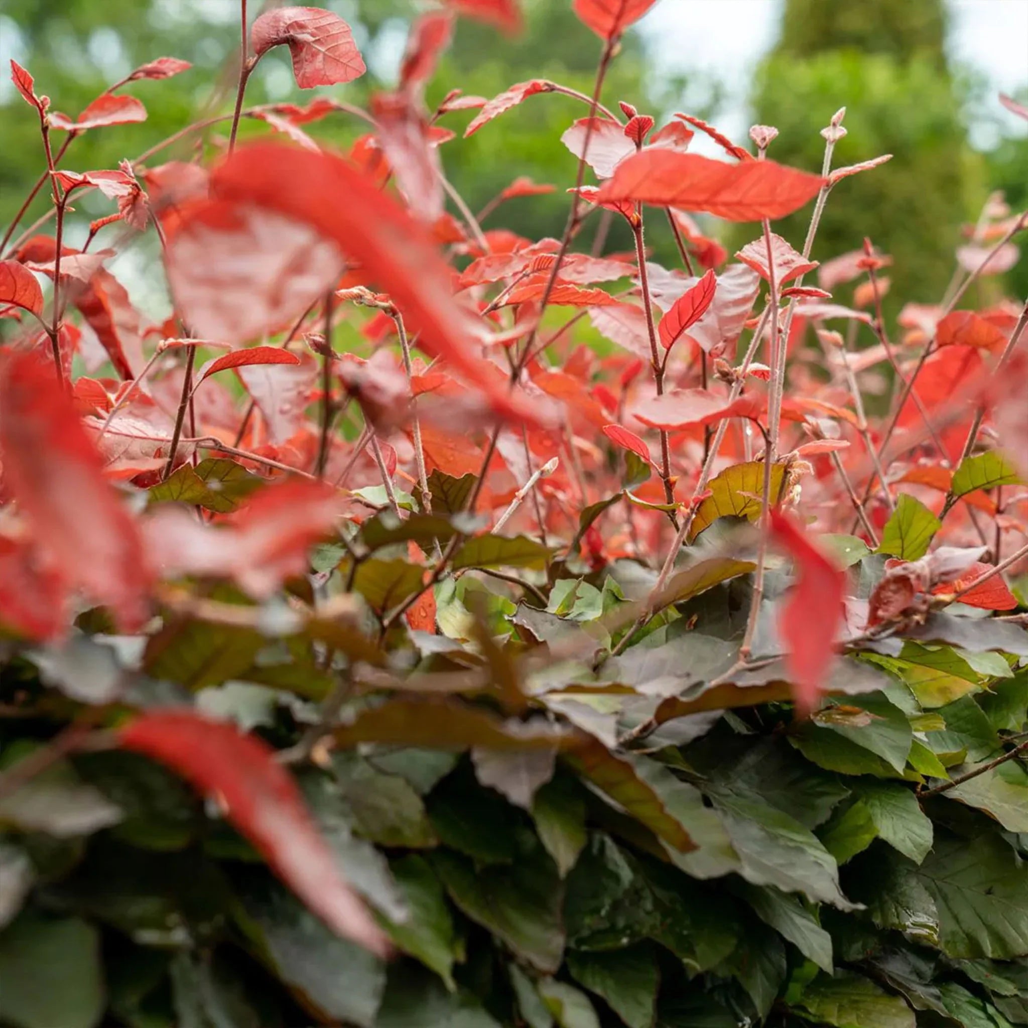 Die Blutbuche ist in unserem Sortiment bei den blattverlierenden Heckenpflanzen zu finden. Die runden Blättern mit dem gewellten Rand sind den Frühling, Sommer und Herbst über lila- rot und im Herbst bleiben sie vertrocknet an der Hecke hängen. Sie fallen erst im Frühling ab, wenn die neuen Triebe anfangen zu sprießen. Die alten Blätter wehen nur vorher runter, wenn es im Winter sehr windig oder extrem kalt ist. Dann wird die Blutbuchenhecke kahl bevor neue Triebe erscheinen. Die rosa bis hell- lilafarbene Farbe der neuen Blätter, die nach und nach dunkler werden, ist ein wahres Naturschauspiel.
