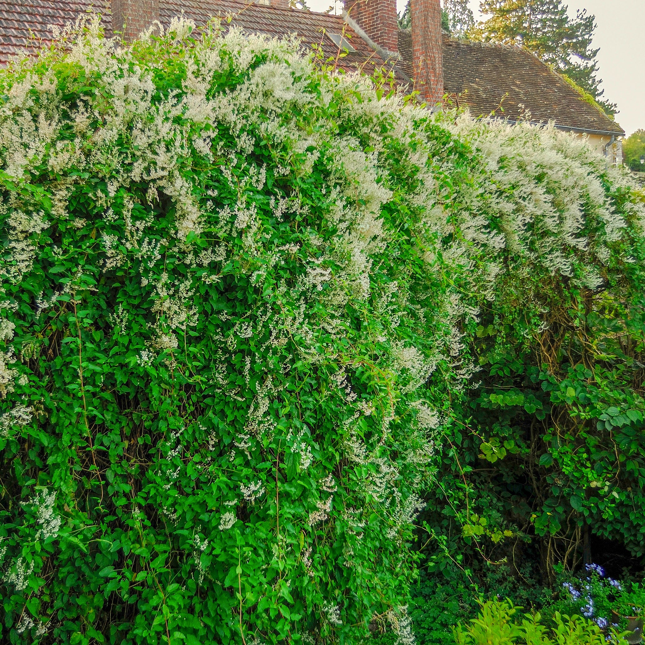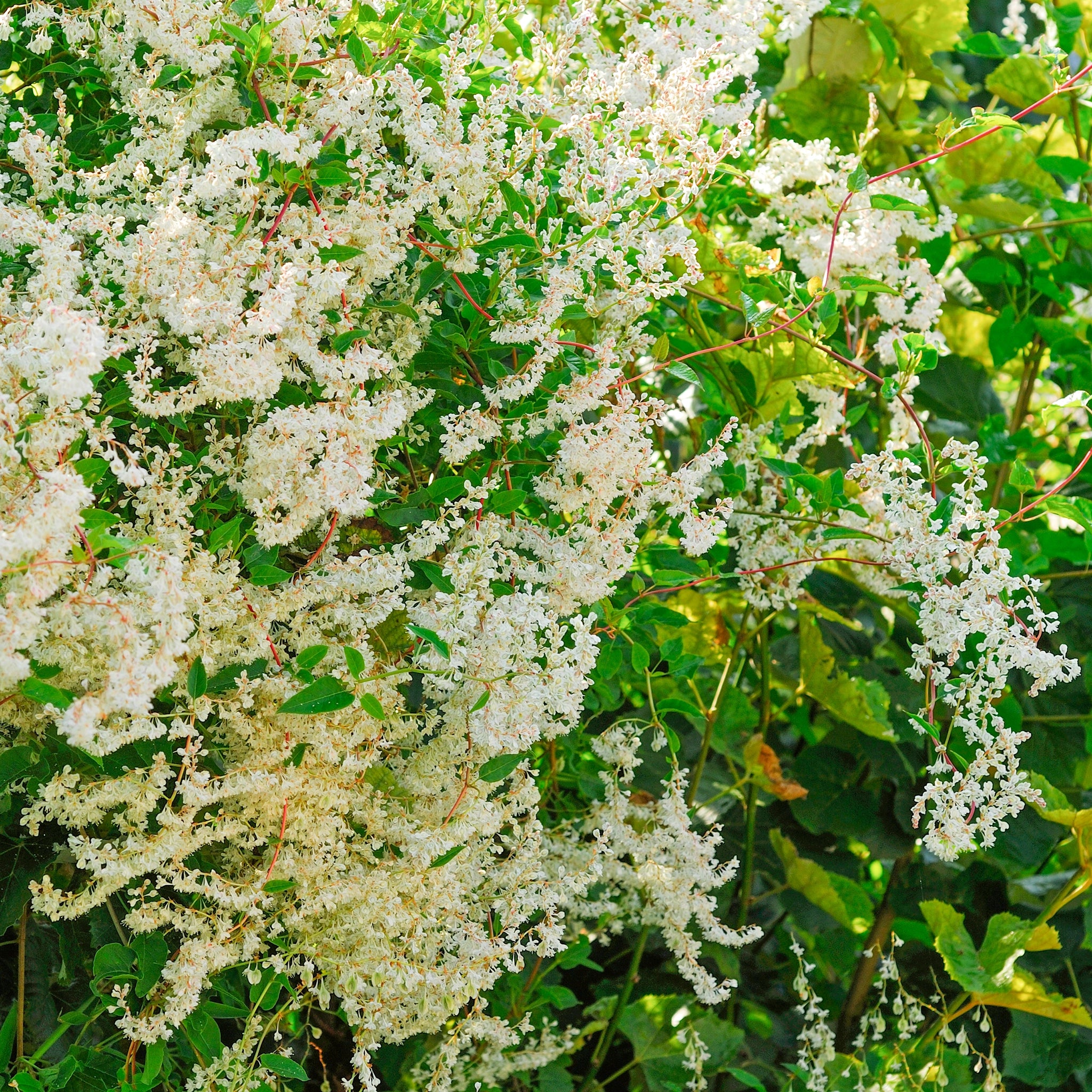 Fallopia aubertii, auch bekannt als Brautschleier, ist eine kräftige und schnell wachsende Kletterpflanze. Dieser laubabwerfende Kletterer kann innerhalb weniger Jahre eine Höhe von bis zu 7 bis 10 Metern erreichen und eignet sich daher ideal zum schnellen Bedecken von Mauern, Zäunen, Bögen und Pergolen. Fallopia aubertii blüht von Juli bis Oktober mit einer Fülle kleiner, weißer Blüten, die in dichten Büscheln wachsen. Diese duften leicht nach Honig und ziehen zahlreiche Bestäuber wie Bienen und Schmetterlinge an. Auf die Blüten folgen kleine rosa Beeren.