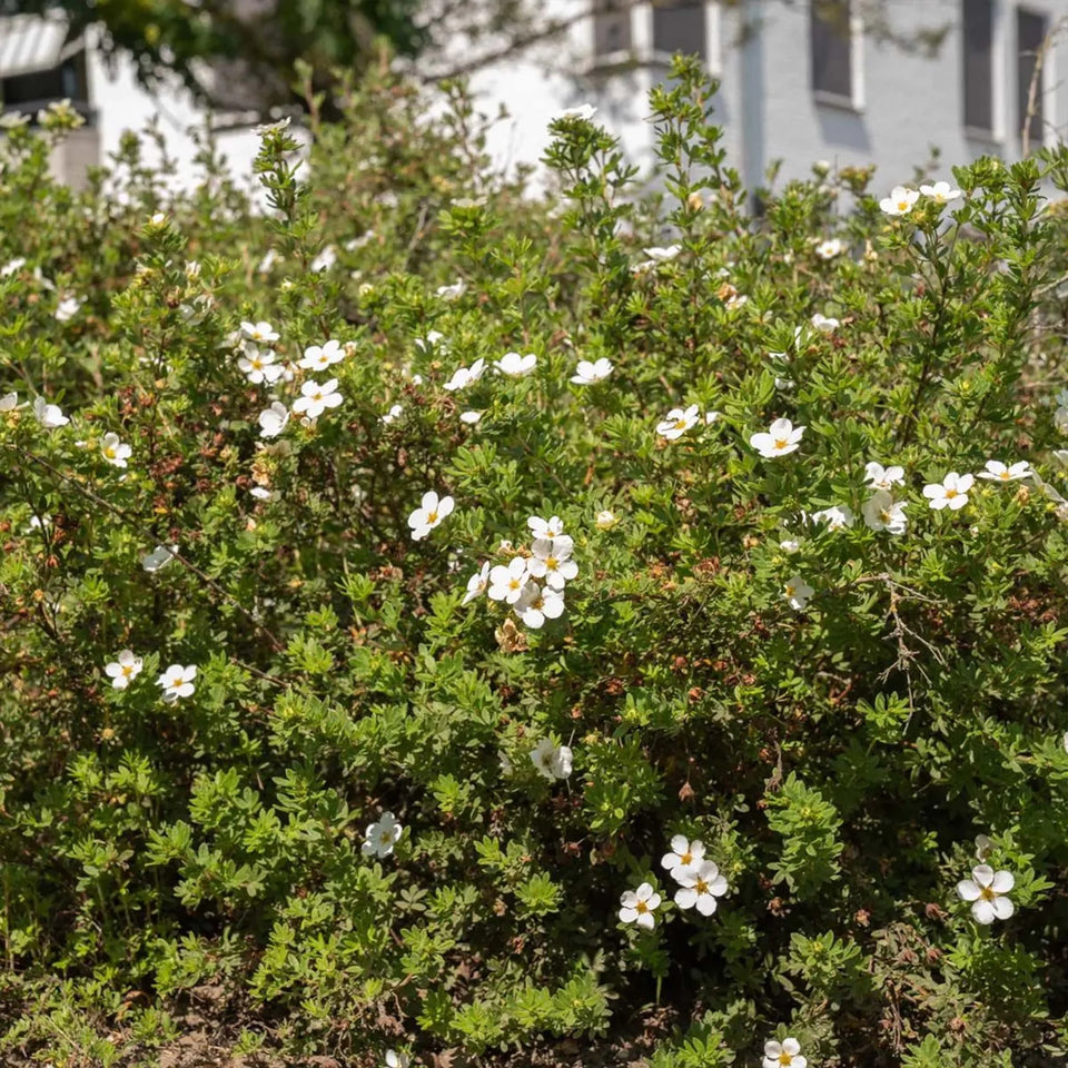 Die Potentilla fruticosa 'Abbotswood' ist eine langblühende Strauch-Pflanze. Die Blütezeit beginnt im Mai und endet erst im September. Und das ist prima, denn immer, wenn Sie bei warmem Wetter noch draußen sitzen können, genießen Sie in Ihrem Garten von diesen weißen Blumen. Diese Sorte gehört auch zu den winterharten Pflanzen, die also auch strengen Frost vertragen können. Sehr schön auch in einer Kombination mit der Potentilla Goldfinger mit ihren gelben Blumen und mit der Potentilla Red Ace mit den roten Blumen.