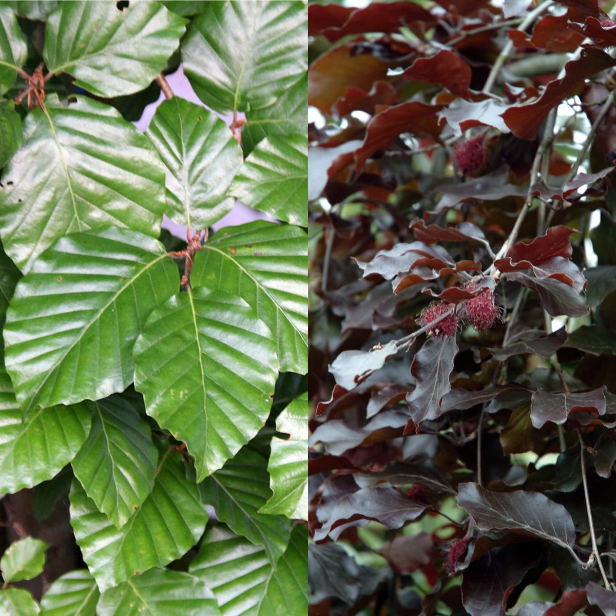 Sowohl die Blutbuche als auch die Gemeine Buche sind beliebte Heckenpflanzen, die jeder kennt. Man findet sie in vielen Gärten, Parks und anderen Grünanlagen. Beide Sorten bieten getrennt oder gemischt in einer Hecke einen schönen Anblick. Die Buche ist laubabwerfend, aber die verdorrten hellbraunen Blätter bleiben nach dem Herbst hängen. Dadurch ist diese gemischte Buchenhecke im Winter trotzdem zum Teil blickdicht und in der gesamten Länge gleich in der Färbung. Im Frühjahr erscheinen dann wieder neue grüne und dunkelrote Blätter. Unser Heckenpaket besteht aus: