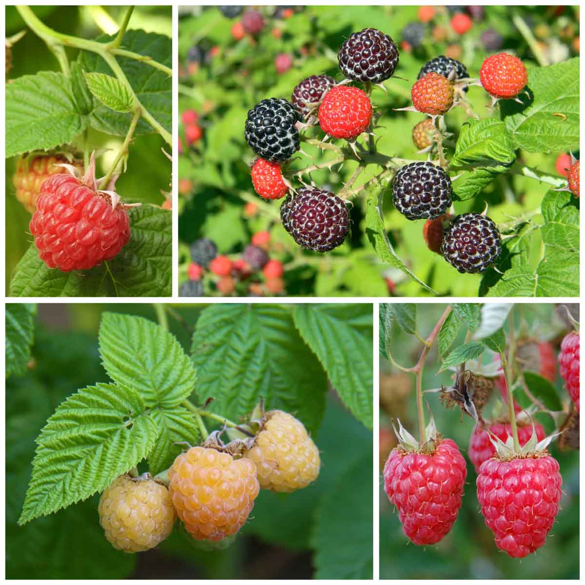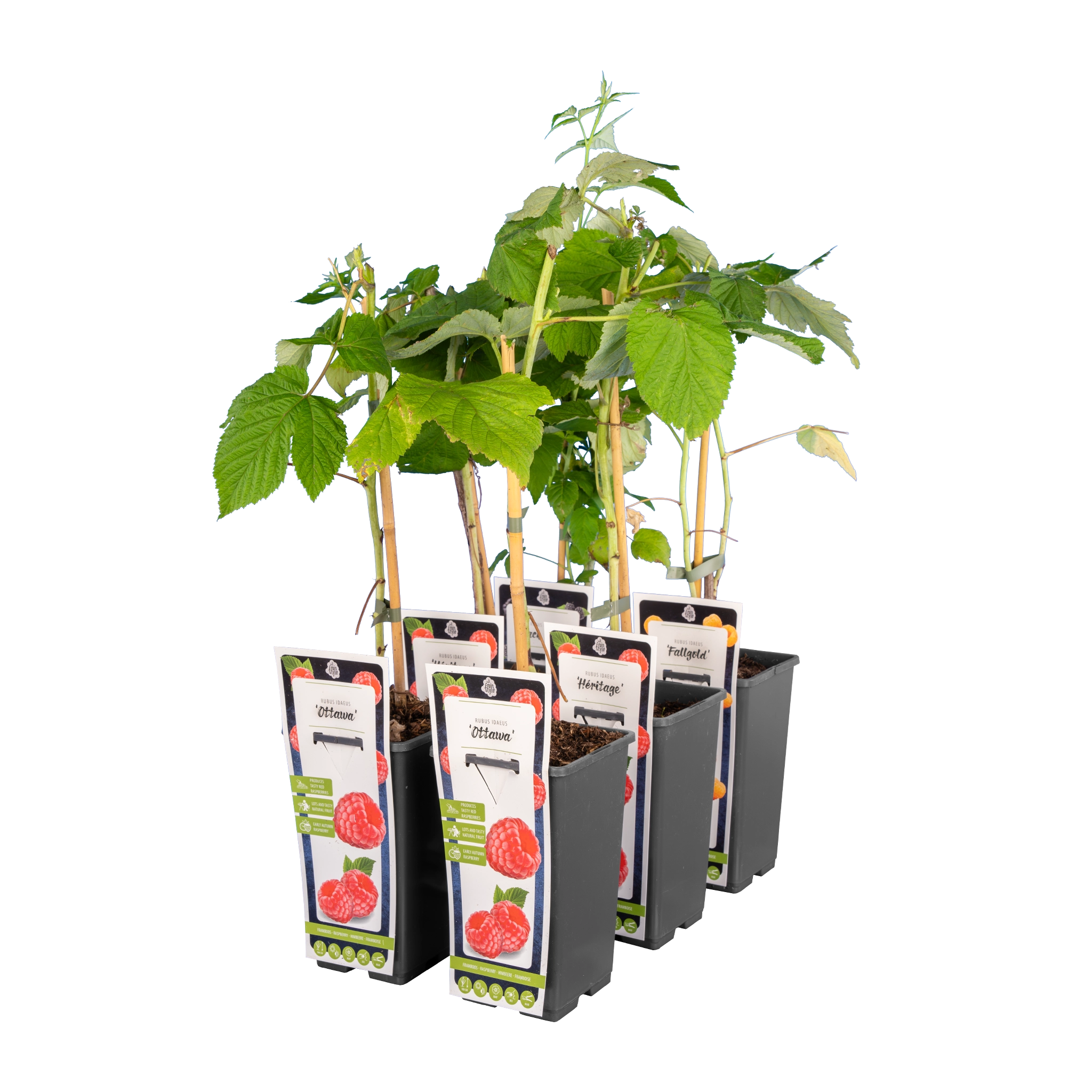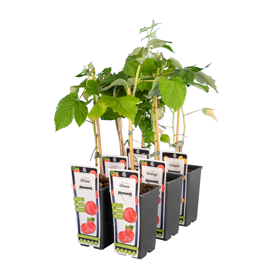 2 x Sommerhimbeere (Rubus i. ‘Ottawa’) 2 x Herbsthimbeere (Rubus i. ‘Héritage’) 1 x Gelbe Sommerhimbeere (Rubus i. ‘Fallgold’) 1 x Schwarze Sommerhimbeere (Rubus o. ‘Black Jewel’)