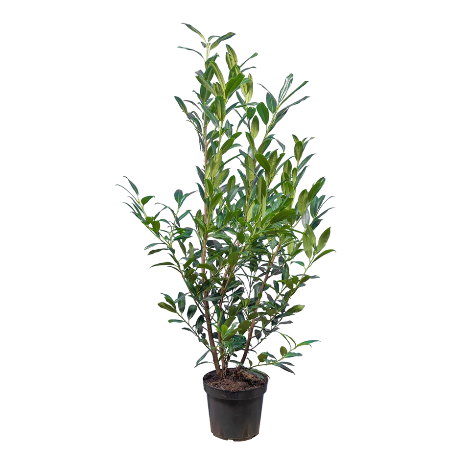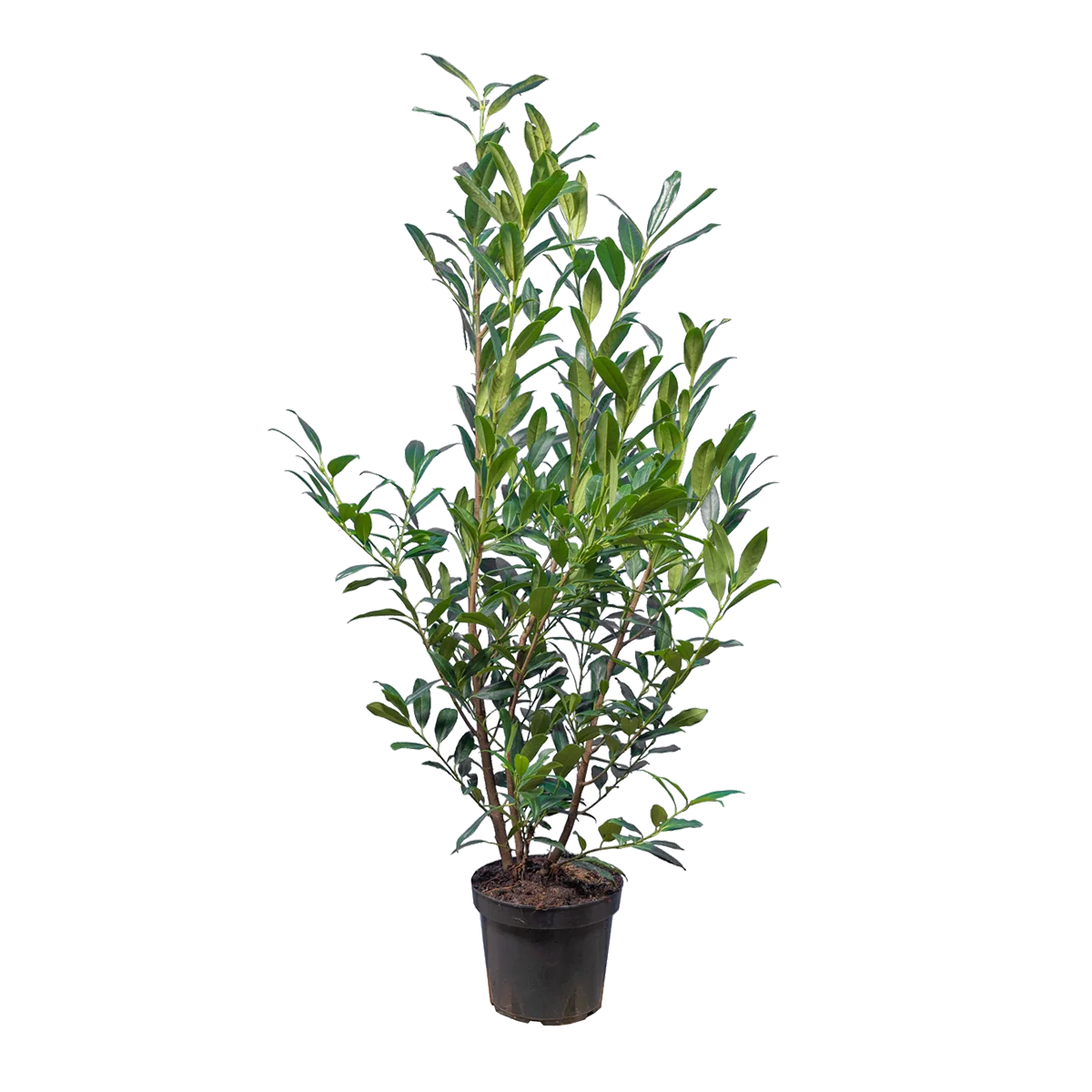 Der Kirschlorbeer Herbergii (Prunus laurocerasus herbergii) ist eine immergrüne Heckenpflanze. Die Kirschlorbeersorte wächst sehr kompakt und ist damit für volle, blickdichte Hecken sehr gut geeignet. Er ist immergrün und behält damit seine Blätter im Winter. Keine kahlen Zweige, sondern saftiges Grün, das ganze Jahr über! Der Herbergii Kirschlorbeer eignet sich für niedrige und mittelhohe Hecken, bis zu 2,5 Meter. Er hat einen schlanken, aufrechten Wuchs und wächst in eine kegelförmige Form. Außerdem zeichnet sich der Prunus Herbergii durch seine schönen Blätter aus: diese sind schmal, ledrig und dunkelgrün glänzend.