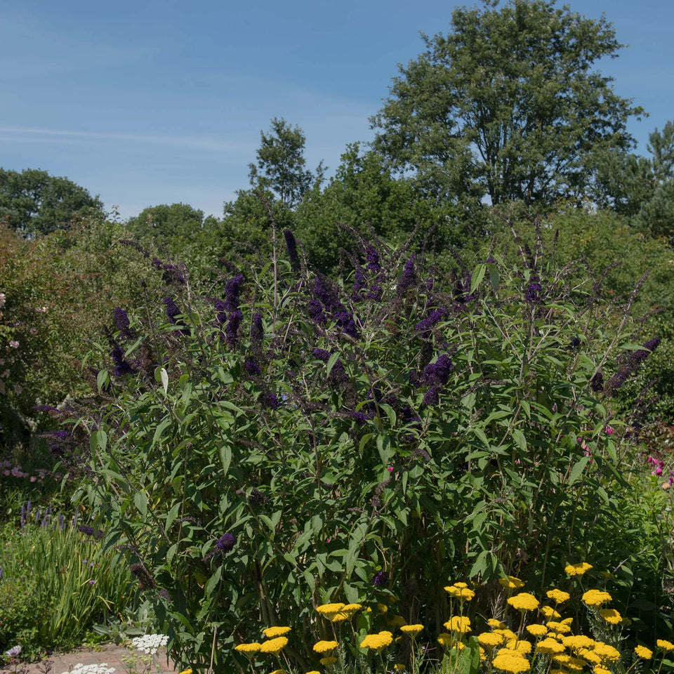 Der Sommerflieder Black Knight (lateinisch: Buddleja davidii 'Black Knight') ist ein prachtvoll blühender Strauch, der allerlei Schmetterlinge und Insekten anzieht. Hauptgrund dafür sind die vielen duftenden, dunkelvioletten Blumenrispen, die die Pflanze von Juli bis Oktober schmückt. Bei Garmundo verkaufen wir aber auch den Schmetterlingsstrauch in allerlei anderen schönen Farben: den Buddleja White Profusion mit weißen Rispen und den Buddleja Pink Delight mit rosafarbenen Rispen. Die verschiedenen Schmetterlingssträucher kann man aber auch ausgezeichnet miteinander in einer informellen Hecke kombinieren. Der lila Sommerflieder befindet sich u.a. auch in unserem gemischten Heckenpaket 'Duftende Hecke'.