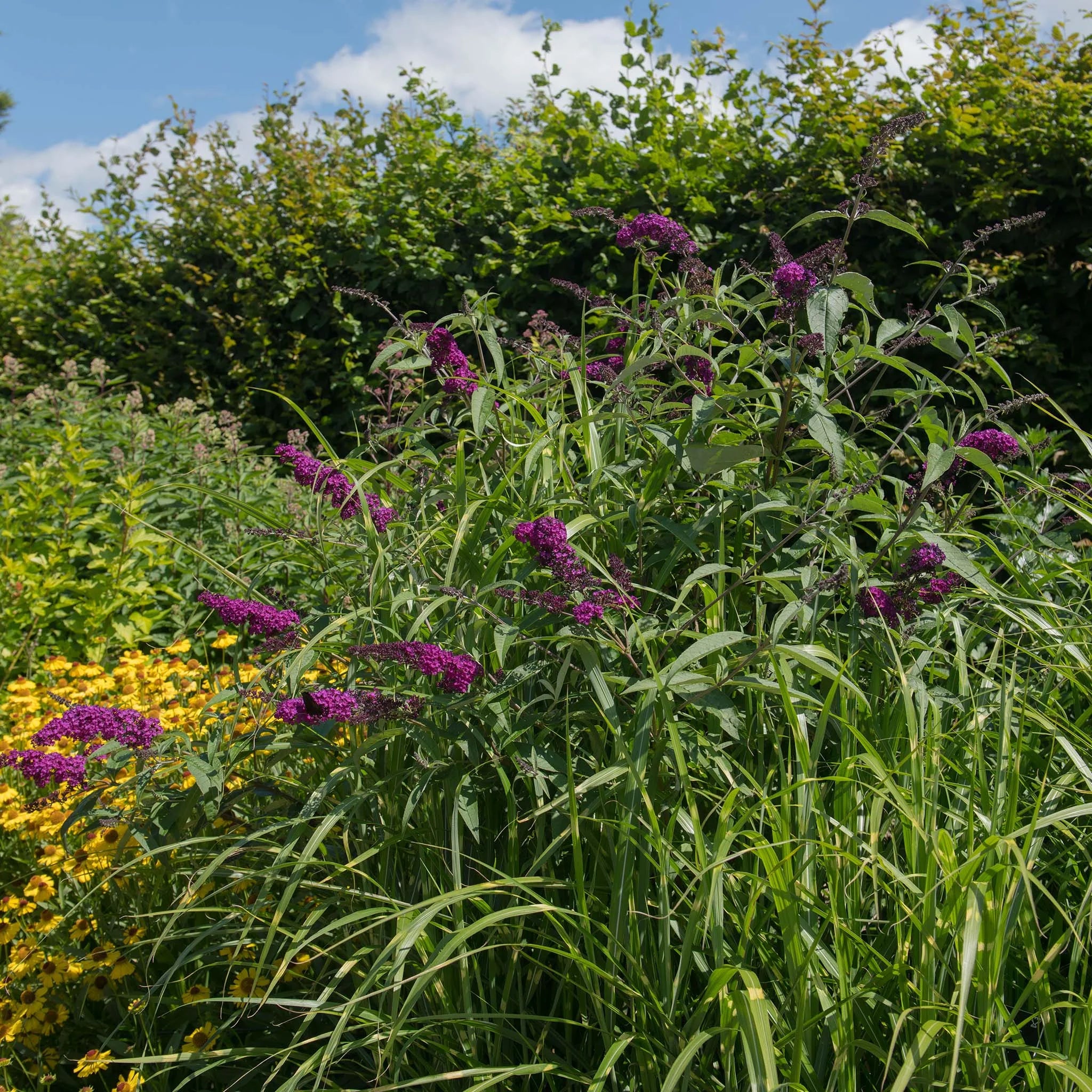 - Wunderschöne violett-rote Blütenrispen im Sommer: zieht Schmetterlinge an