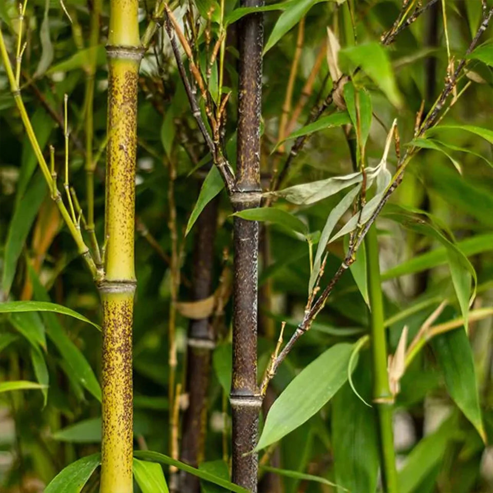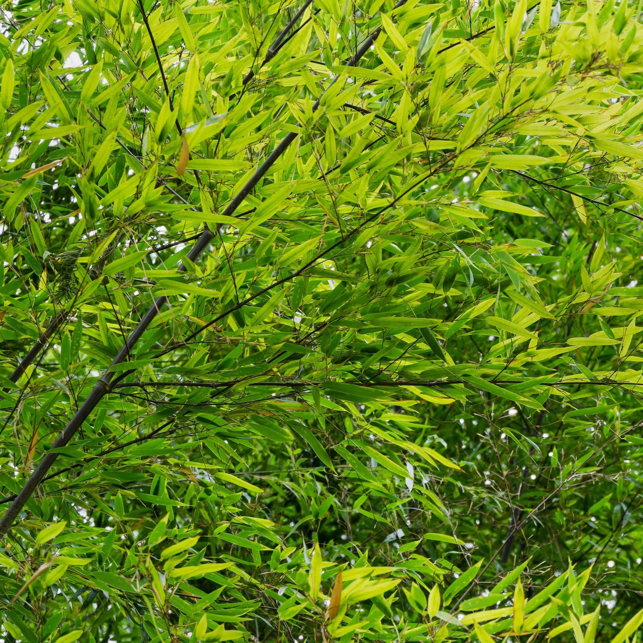 Phyllostachys nigra stammt ursprünglich aus Ost- und Zentralchina. Die jungen Stiele des Schwarzrohrbambus sind zunächst grün und verfärben sich nach einigen Jahren in ein glänzendes Schwarz. Die Sonne fördert die Verfärbung der Stiele, die 2 bis 4 cm dick werden können. Es handelt sich um einen immergrünen Bambus mit einem eher lockeren, aufrechten, säulenförmigen Wuchs. Die glänzenden schmalen Blätter sind etwa 12 cm lang und haben eine mittelgrüne Farbe. Besonders das junge, noch hellgrüne Laub bildet einen wunderschönen Kontrast zu den älteren, schwarzen Stielen. Wenn Sie mit diesem prächtigen Bambus noch mehr Eindruck erzielen möchten, dann entfernen Sie die unteren Seitentriebe und Blätter. Dadurch werden die schwarzen Stiele gut sichtbar und erzielen eine noch größere Wirkung!