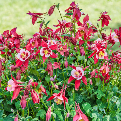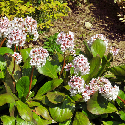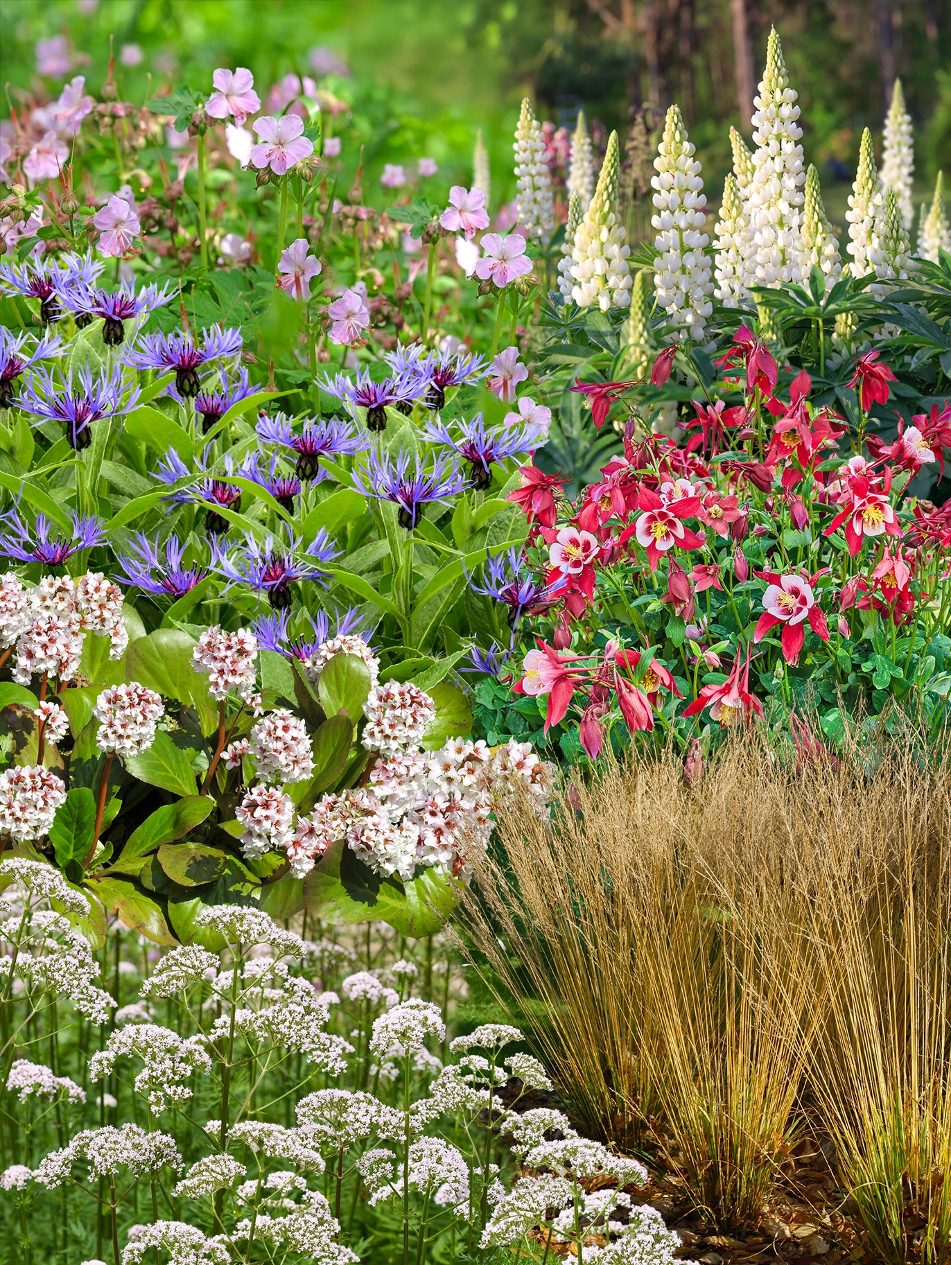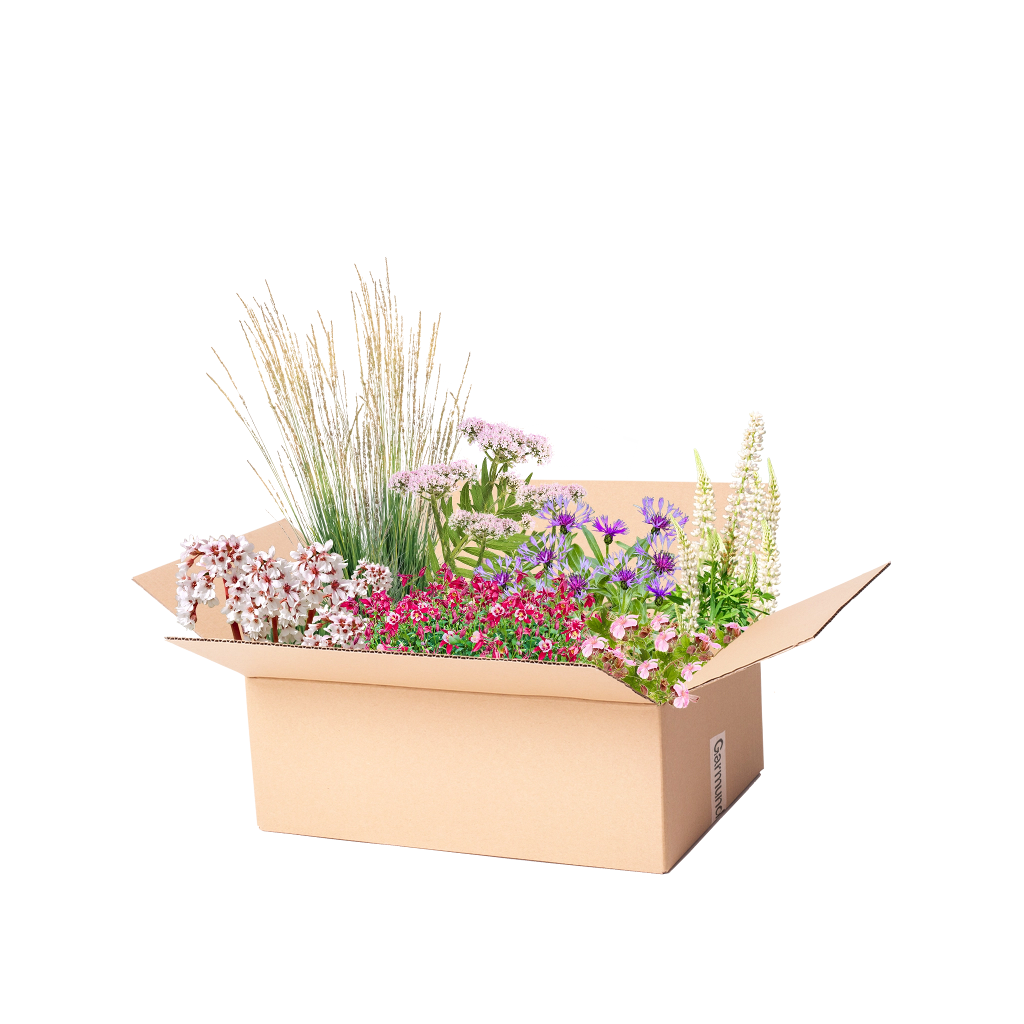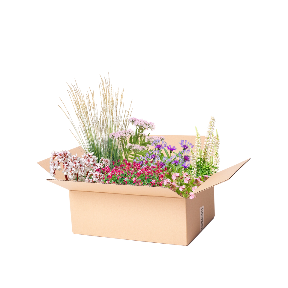 Unser lila-weißes Blumenbeet blüht von April bis September. Die Blütezeit beginnt im April mit die Bergenie (Bergenia ‘Bressingham White‘). Diese erkennt man an Ihrem schönen, lederartigen Blatt, das auch im Winter nicht abfällt. Im Mai fängt auch die Alpen-Akelei (Aquilegia ‘Crimson Star‘) an zu blühen. Im Juni ist die Bergenie schon wieder verblüht, aber in diesem Monat erleben Sie ein wahres Blütenfest mit diesem Beet! Die Flockenblume/Kornblume (Centaurea montana ‘Grandiflora‘), der Balkan-Storchschnabel (Geranium Macrorrhizum ‘Ingwersen’s Variety‘), die Weiße Lupine (Lupinus ‘Gallery White‘), und der Echte Baldrian (Valeriana officinalis) öffnen dann ihre Blüten. Abschließend gibt es dann noch das Kleine Pfeifengras/Heidebraut (Molinia caerulea), das von Juli bis September blüht. Die Pflanzen für dieses Beet stehen am liebsten in der Sonne. Die Bergenie kann aber auch im Schatten und in der Sonne gedeihen. Dieses Staudenbeet Paket kann man sehr gut mit dem Staudenbeet Paket Blau und Weiß oder mit anderen pakete kombinieren.
