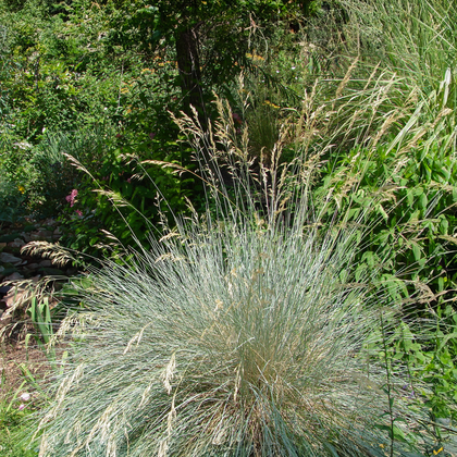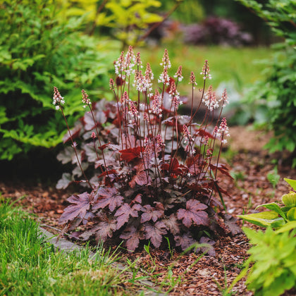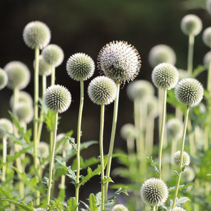 Das Schöne an der silbernen Farbe ist, dass diese nicht nur die Blumen zeichnet, sowie im Fall der Großen Sterndolde (Astrantia major) und bei der Kugeldistel (Echinops ‘Arctic Glow‘). Bei vielen Stauden kommt die silberne Farbe nämlich auch in den Blättern vor. Das ist z.B. bei der Silberraute (Artemisia ludoviciana ‘Silver Queen‘), dem Saphirsprudel/Blaustrahlhafer (Helictotrichon sempervirens, der Gefleckten Taubnessel (Lamium maculatum ‘Beacon Silver‘) und dem Eselsohr/Hasenohr (Stachys byzantina) der Fall. Einige dieser Pflanzen haben ausschließlich silberfarbige Blätter, bei anderen sind es wiederum nur silberne Flecken in den Blättern, sowie bei der Gefleckten Taubnessel. Das Silberglöckchen (Heuchera ‘Chocolate Ruffles‘) blüht aber sehr schön weiß und hat ein lila-braun gefärbtes Blatt. Die Pflanzen in diesem Staudenbeet Paket blühen zwischen Mai und September, aber von den hübschen Farben der Blätter können Sie natürlich das ganze Jahr genießen. Die beste Lage für dieses Beet ist in der Sonne oder im Halbschatten. Sie sollten aber die Gefleckte Taubnessel (Lamium maculatum) so gut wie möglich in den Schatten setzen, eventuell im Schatten anderer Pflanzen, wenn ansonsten wenig Schatten vorhanden ist.