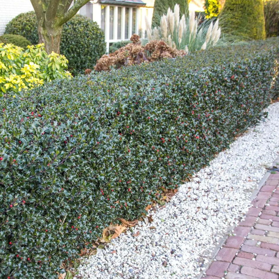 Die Ilex meserveae 'Blue Maid' ist eine weibliche Stechpalmenart, die im Spätsommer schöne, rote Beeren entwickelt. Dies steht im Gegensatz zu den männlichen Stechpalmenarten wie der Blue Prince Stechpalme und der Heckenpracht Stechpalme. Diese Beeren bleiben fast den ganzen Winter über und sorgen für einen schönen Anblick. Und während des dunklen Monats Dezember können Sie die Beeren schön in einem Weihnachtsstück verwenden. Die Beeren sind für Menschen und die meisten Tiere giftig, aber nicht für Vögel. Unsere geflügelten Freunde genießen die Früchte und eine Blaue Maid-Stechpalmenhecke mit roten Beeren im Herbst und Winter bringt Leben in Ihren Garten.