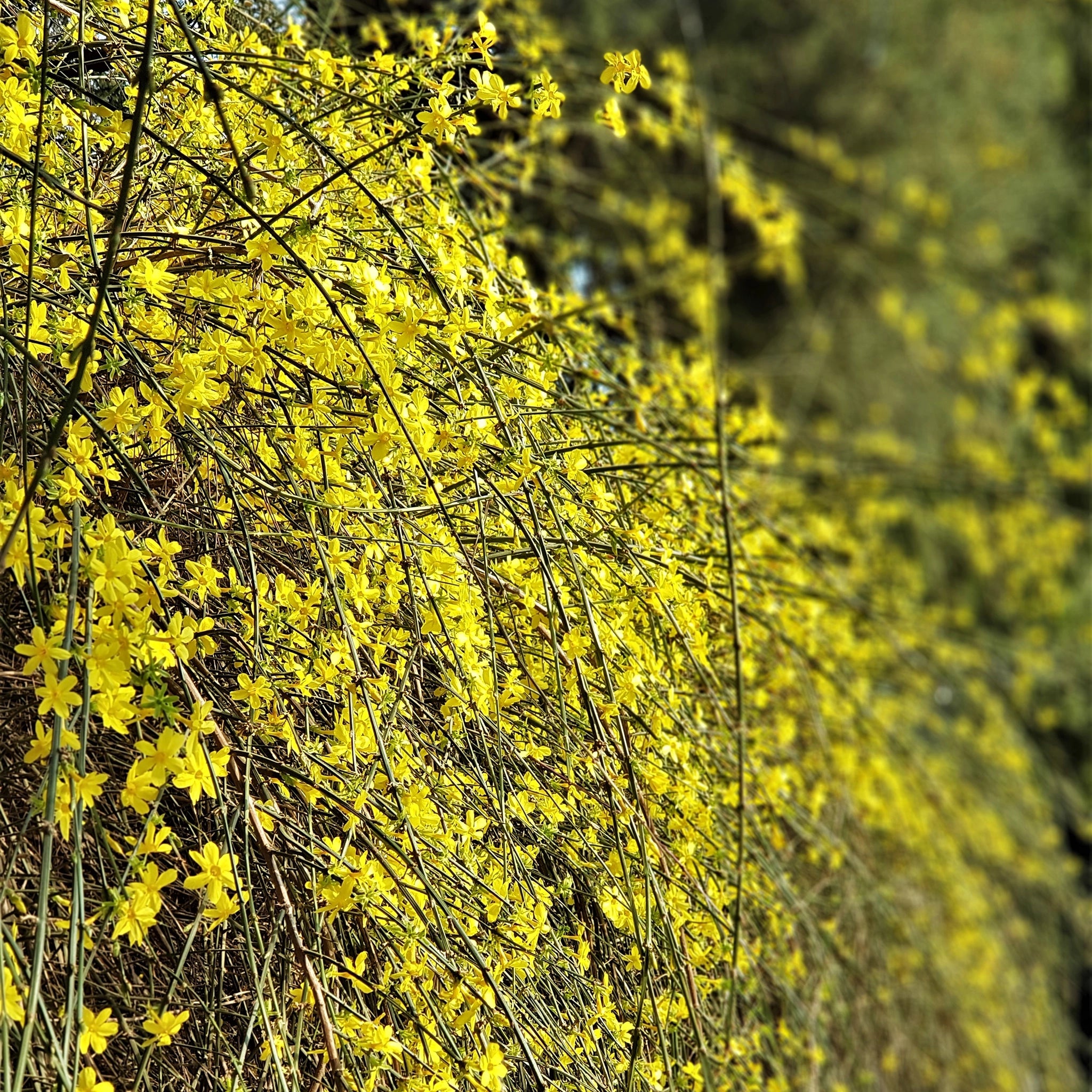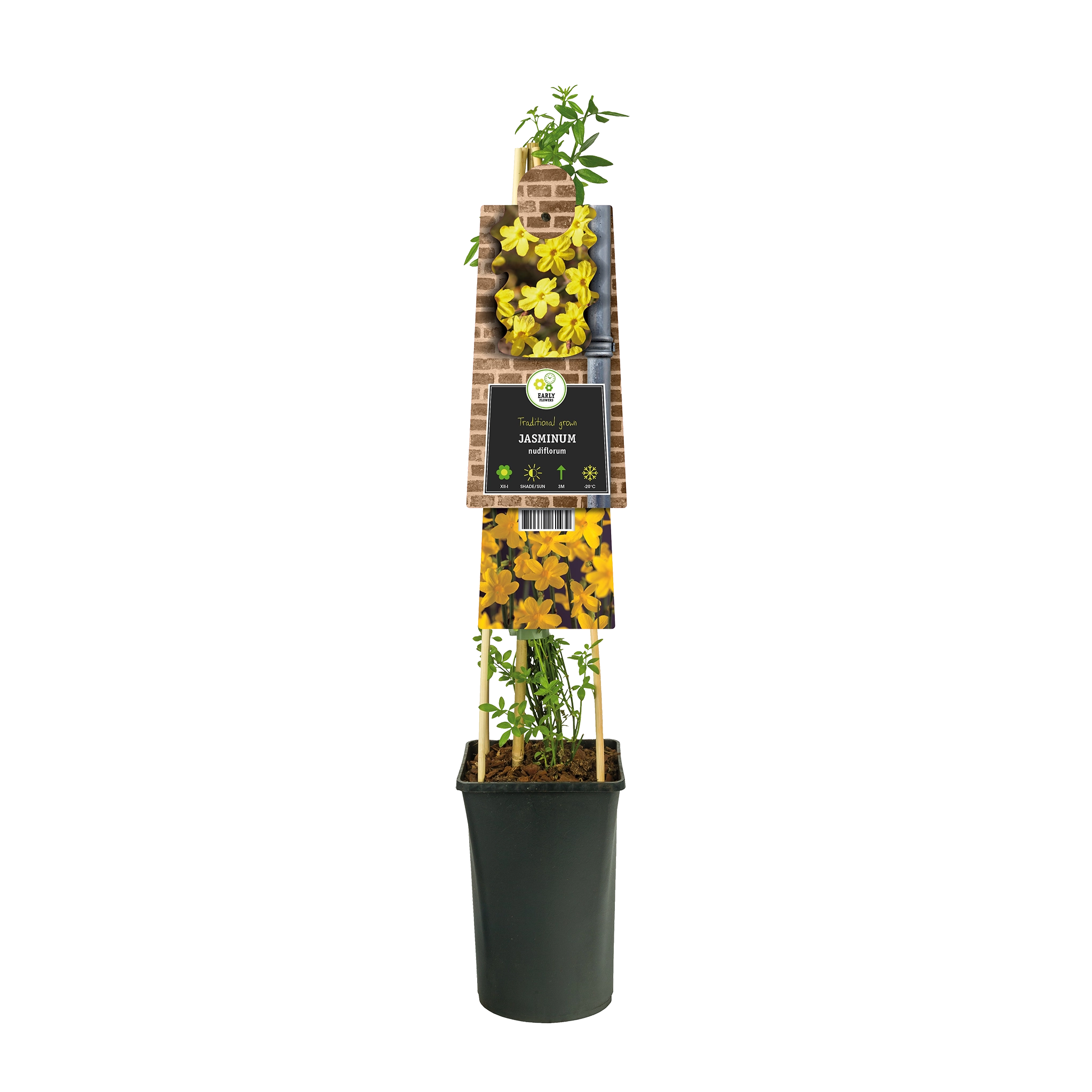 Möchten Sie etwas mehr Farbe in Ihren Wintergarten bringen? Dann entscheiden Sie sich für Jasminum nudiflorum, auch Winterjasmin genannt. Diese elegante, laubabwerfende Kletterpflanze stammt ursprünglich aus China und blüht ab Dezember mit zahlreichen leuchtend gelben Blüten, die oft schon erscheinen, bevor die Blätter sprießen. Winterjasmin kann eine Höhe von 1,5 bis 3 Metern erreichen und hat frischgrüne, überhängende Zweige. Diese sind sehr biegsam, sodass Sie sie leicht führen können.